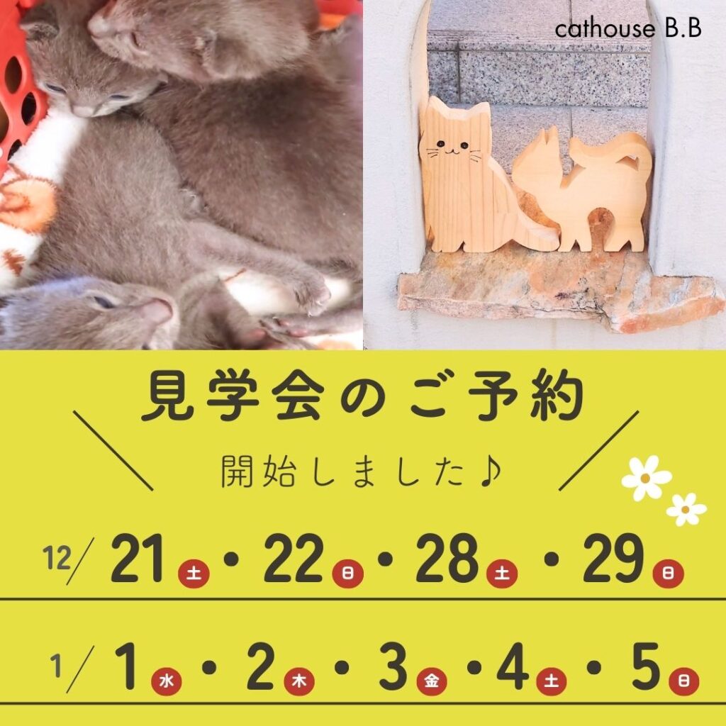今年もあと少しとなりましたね♪キャットハウスB.Bでは、可愛い赤ちゃんたちの見学会を行いますのでお早めにご予約下さい★ご予約・ご相談は、LINEかお問い合わせフォーム... -